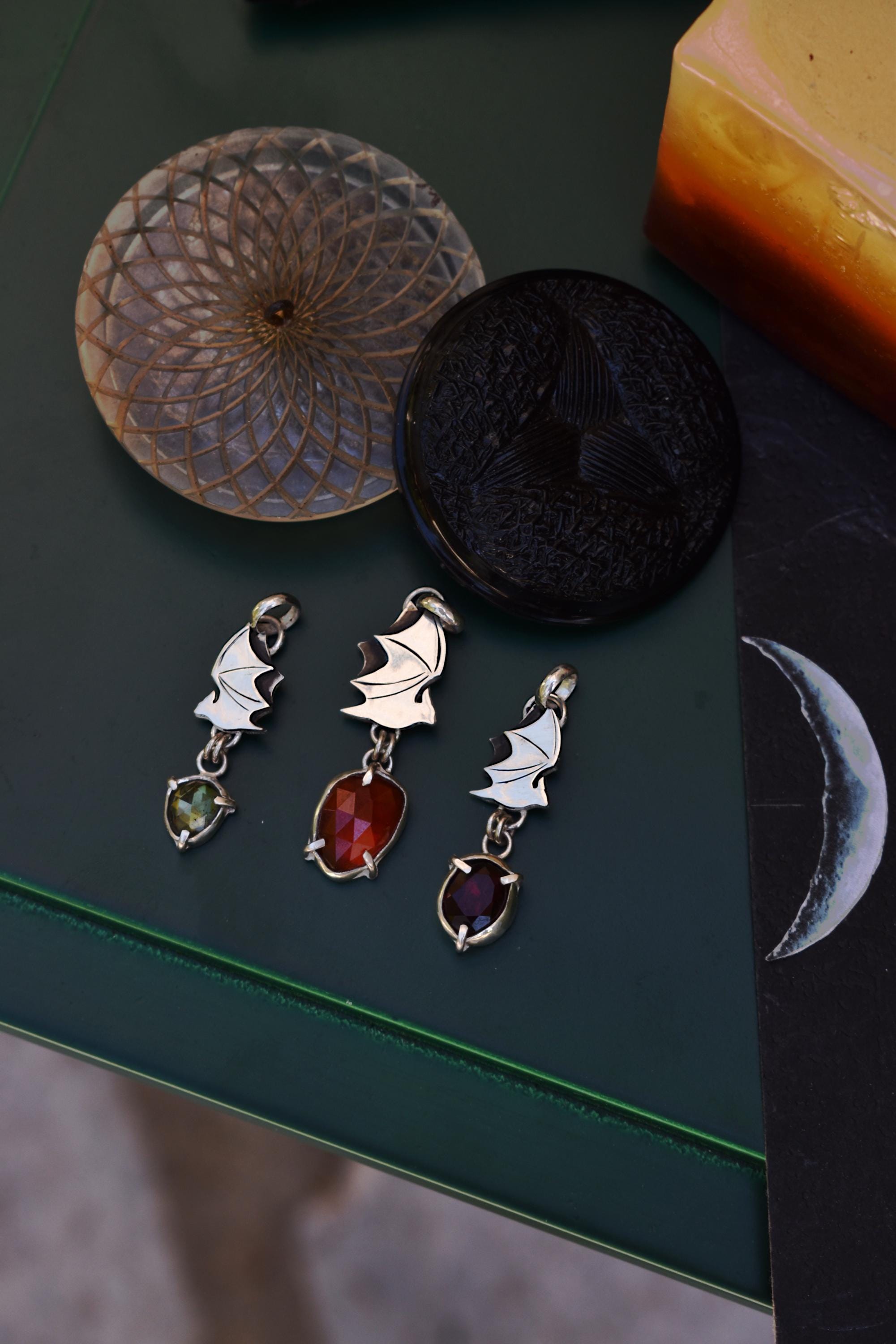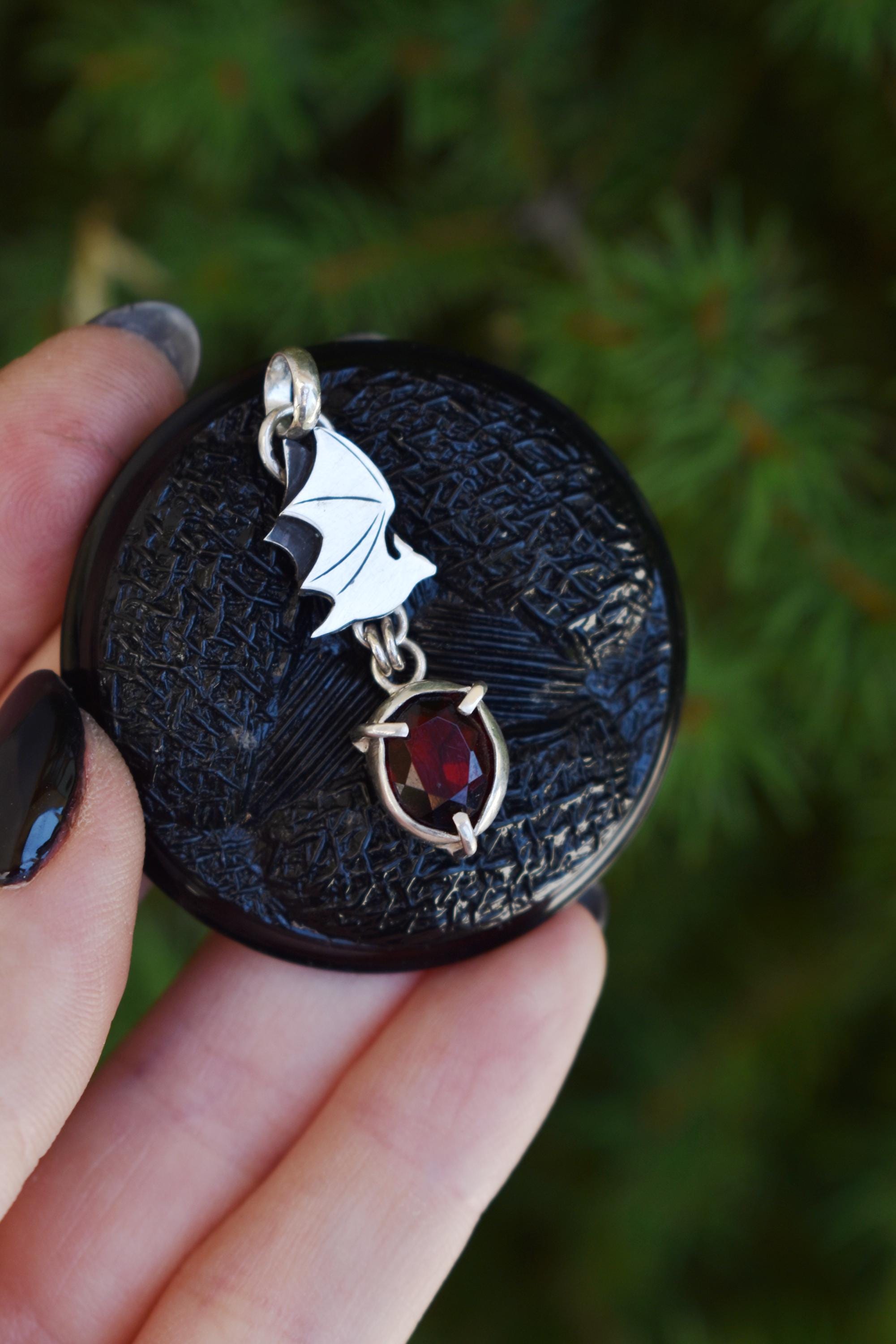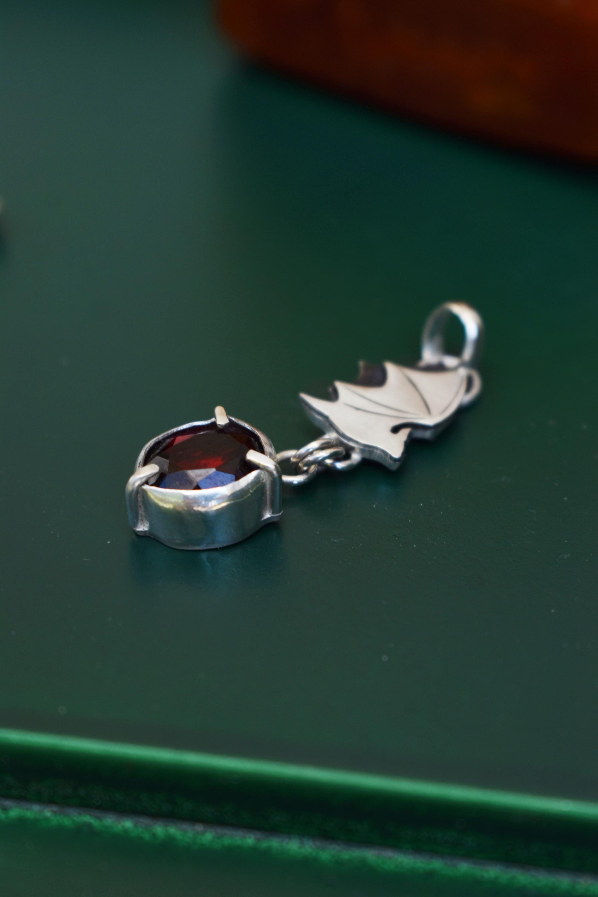 A cute bat with engraved wing details is ready to fly to the night! A single garnet dangles at the bottom of the piece. The bat is draw and cut by hand. Then soldered in two layers of silver to add more texture to the piece. The garnet is set in a handmade fine silver bezel with a close back plate.