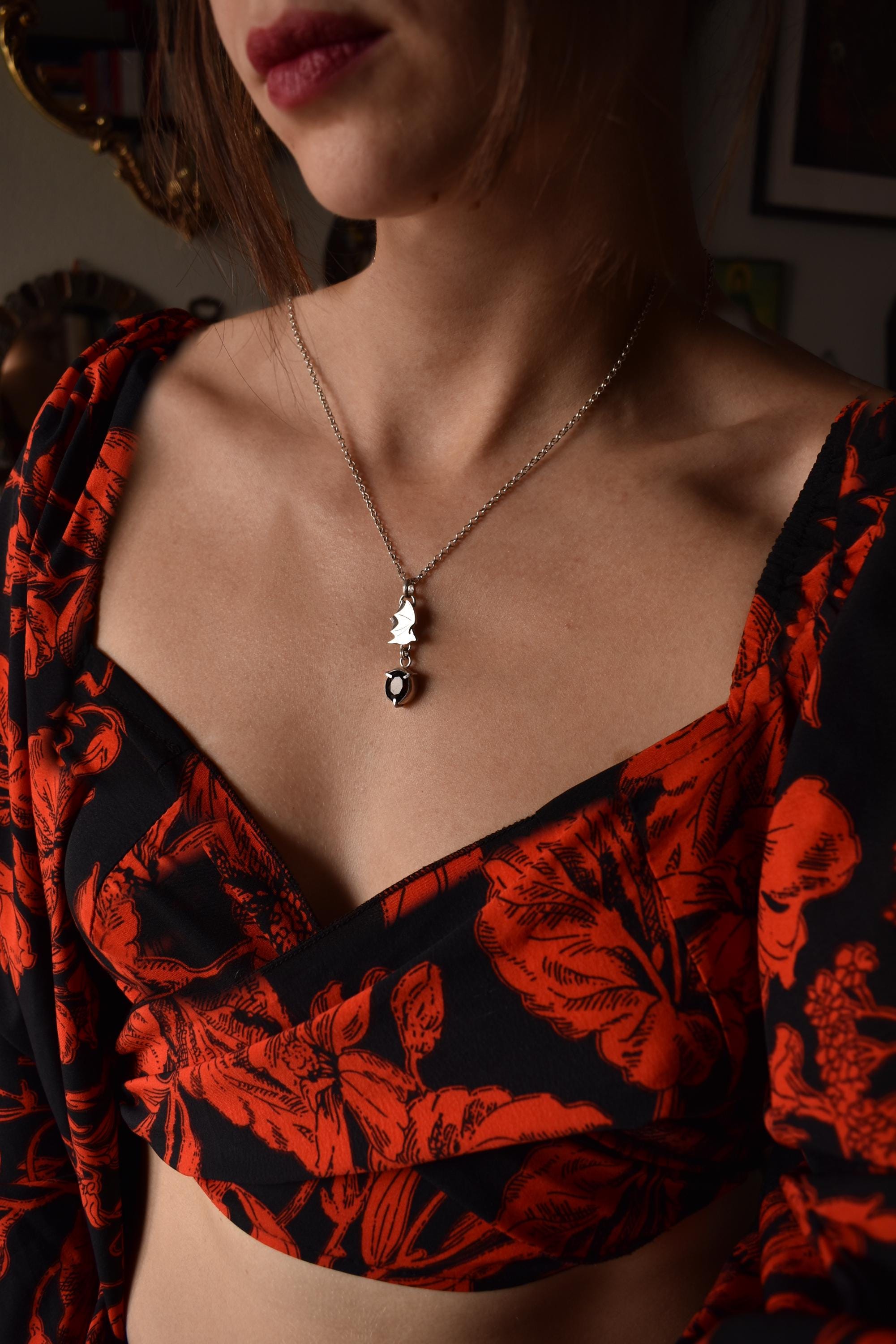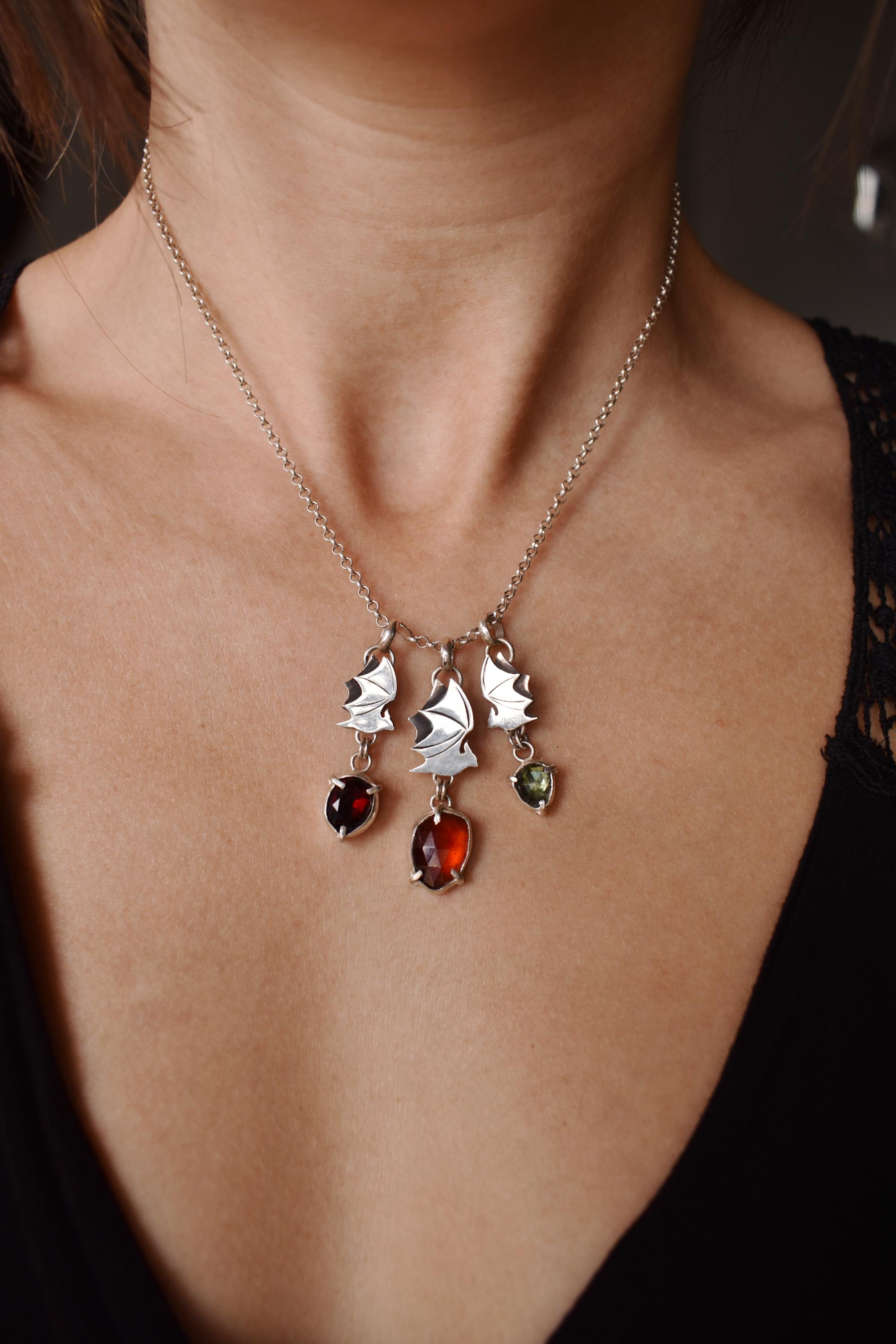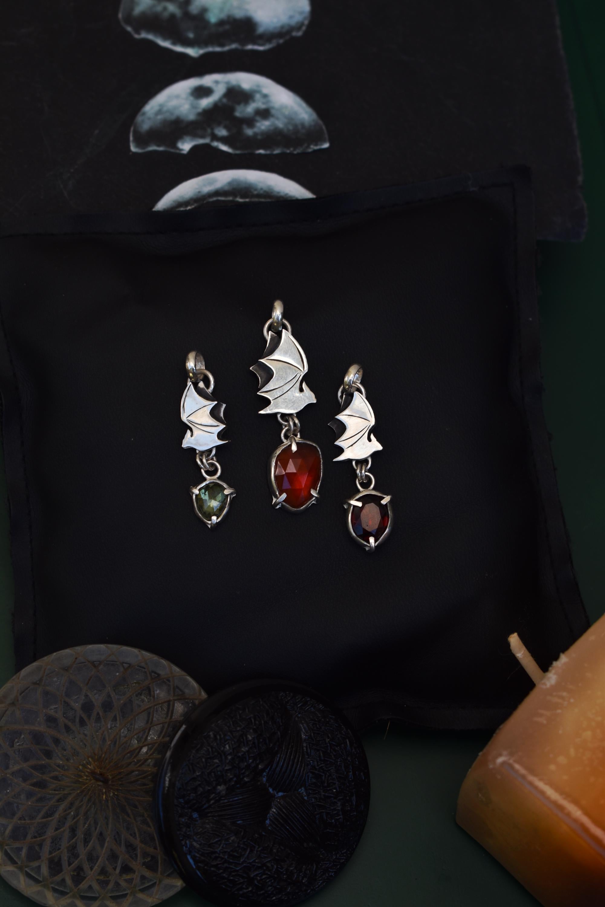 A cute bat with engraved wing details is ready to fly to the night! A single garnet dangles at the bottom of the piece. The bat is draw and cut by hand. Then soldered in two layers of silver to add more texture to the piece. The garnet is set in a handmade fine silver bezel with a close back plate.
