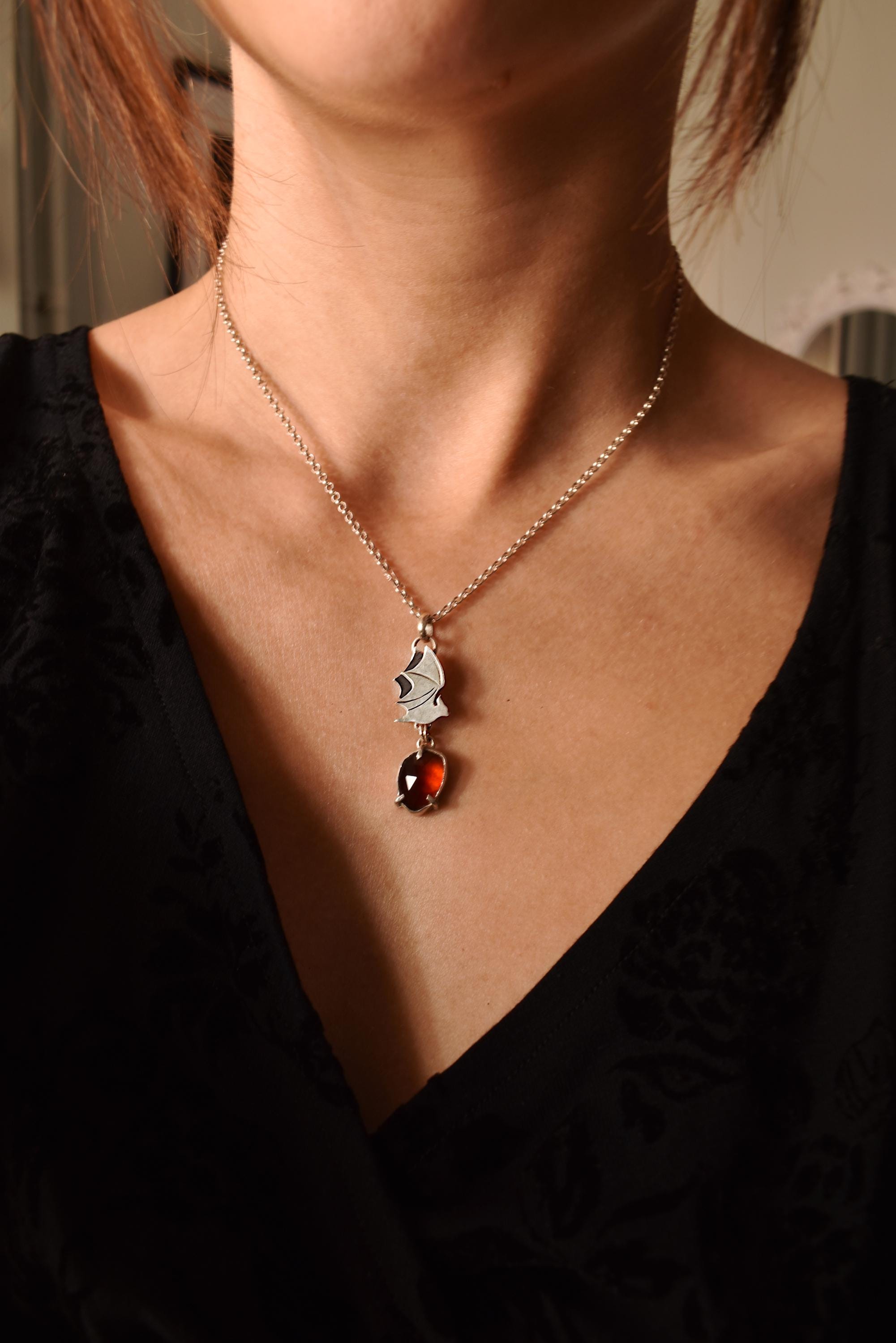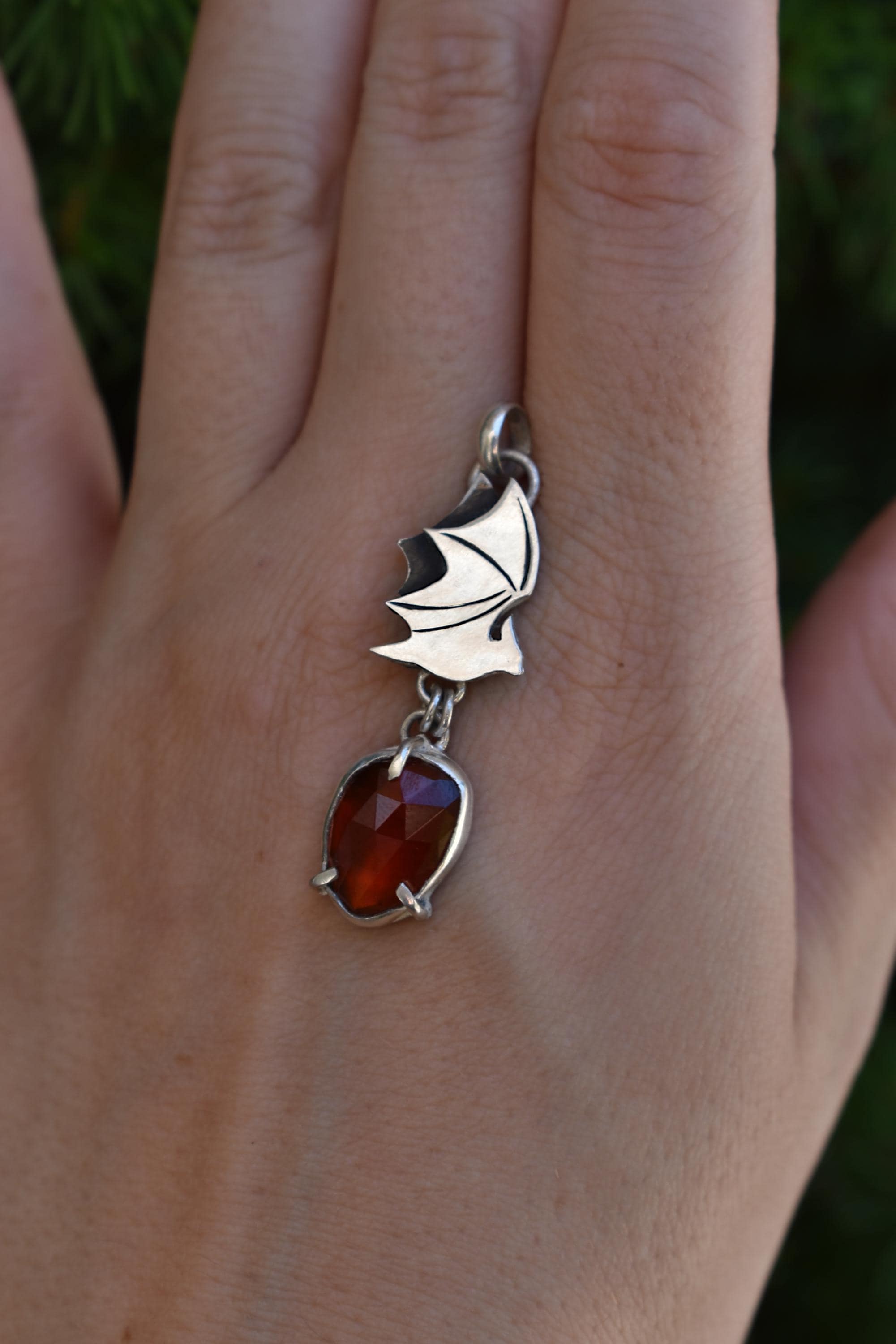 A cute bat with engraved wing details is ready to fly to the night! A single hessonite garnet dangles at the bottom of the piece. The bat is draw and cut by hand. Then soldered in two layers of silver to add more texture to the piece. The garnet is set in a handmade fine silver bezel with a close back plate.