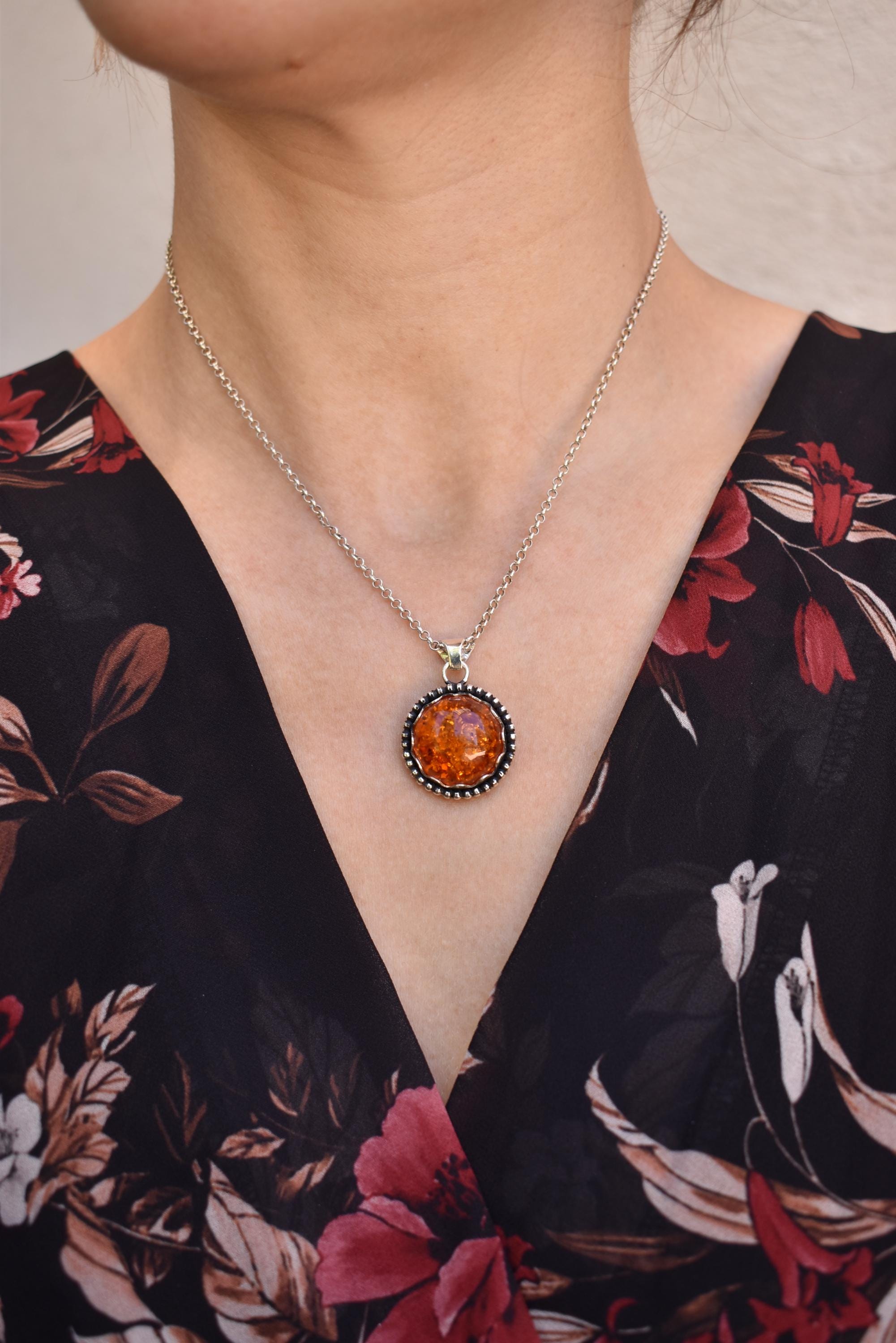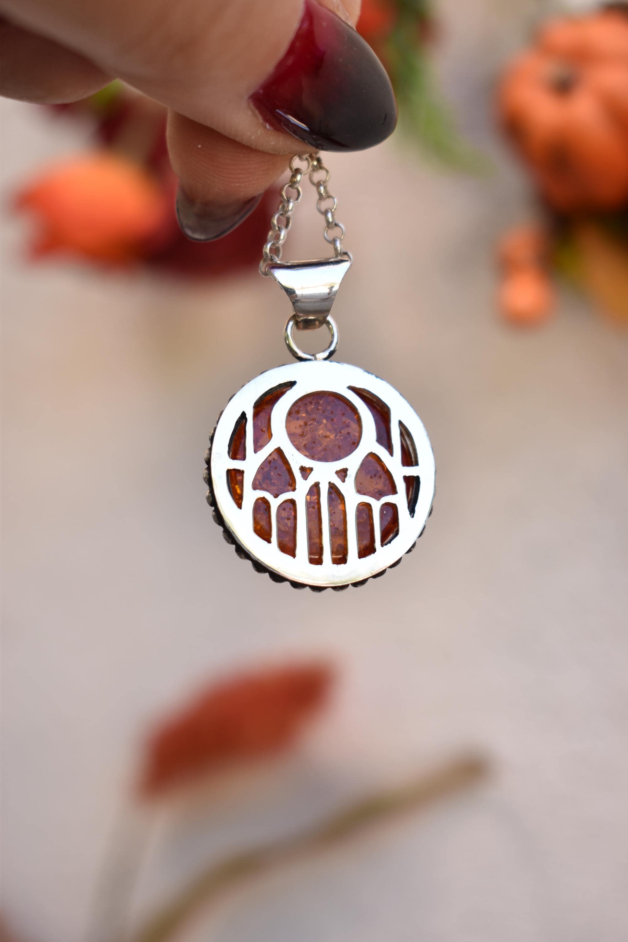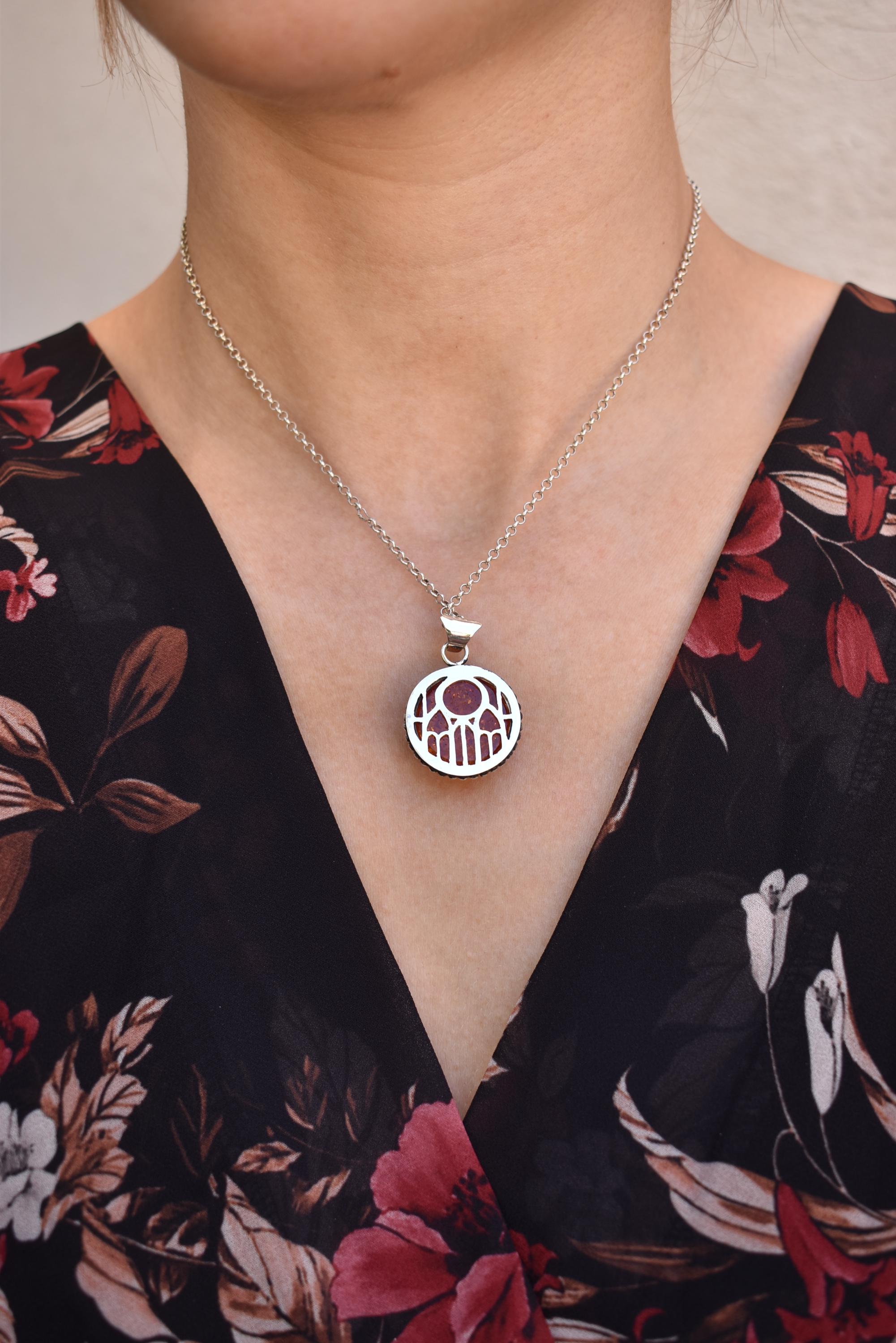 A necklace made completely by hand from solid sterling silver sheet. The cutout at the back is inspired by cathedrals. The design at the back is completely saw by hand. I The cutouts have left open so you can see the stone and give the illusion of stained glass. The stone is set in a scalloped fine silver bezel that is surrounded by a beaded wire. The piece is dangling from sterling silver bail.