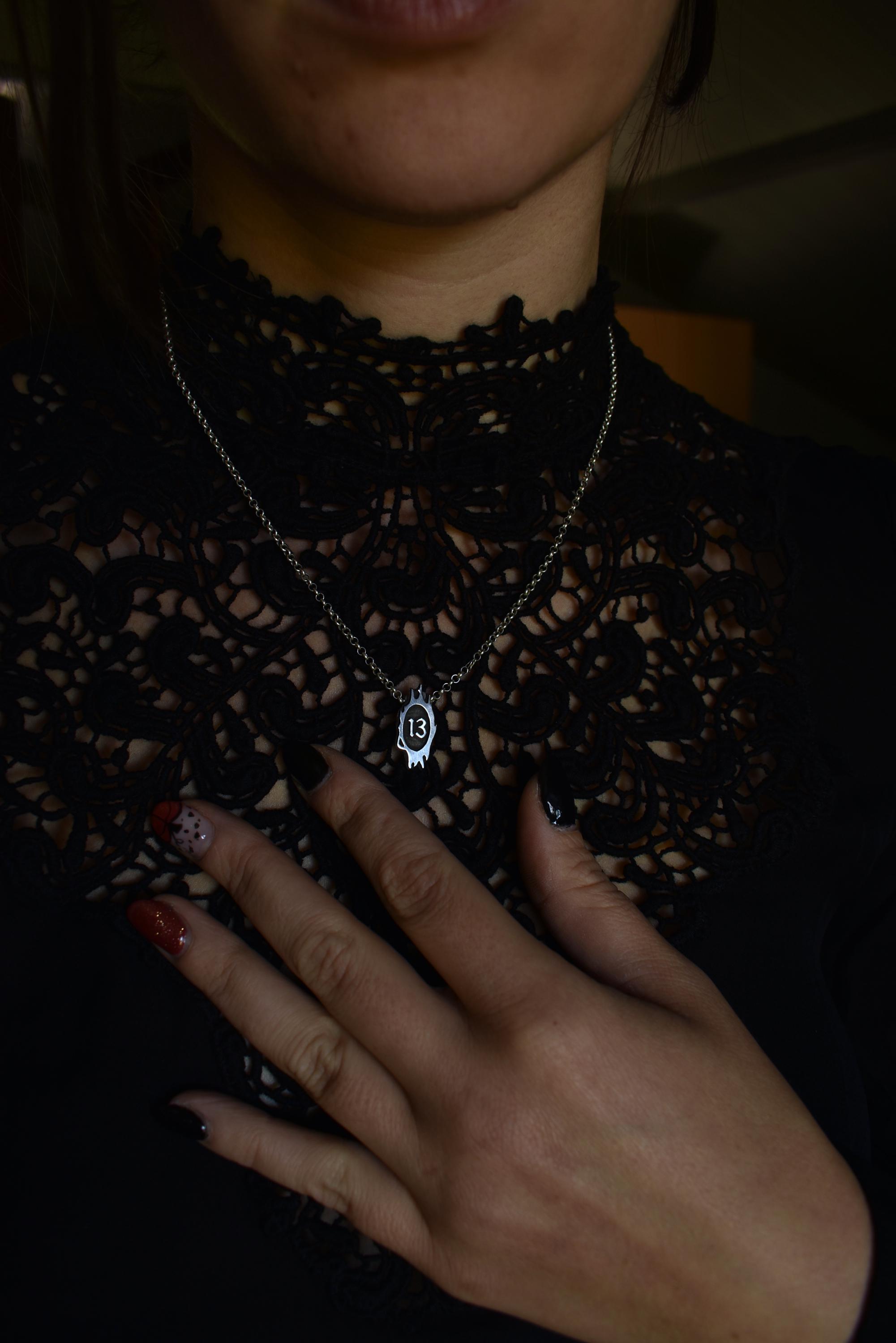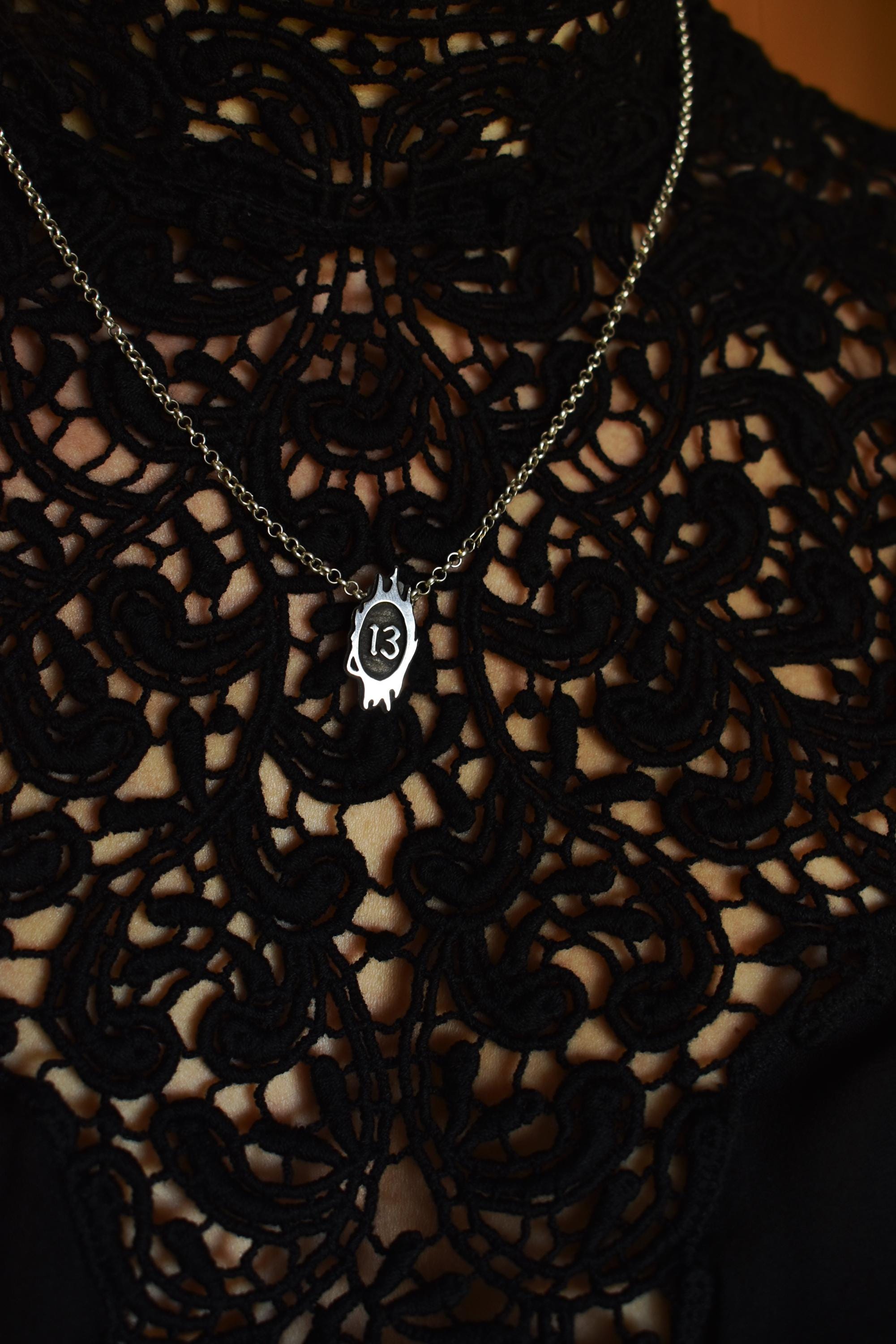 Lucky 13 necklace. This spooky design features a hand-cut 13 number surrounded by intricate spiky detailing. This piece for me is a symbol of good luck. "I used all my good luck to find you".