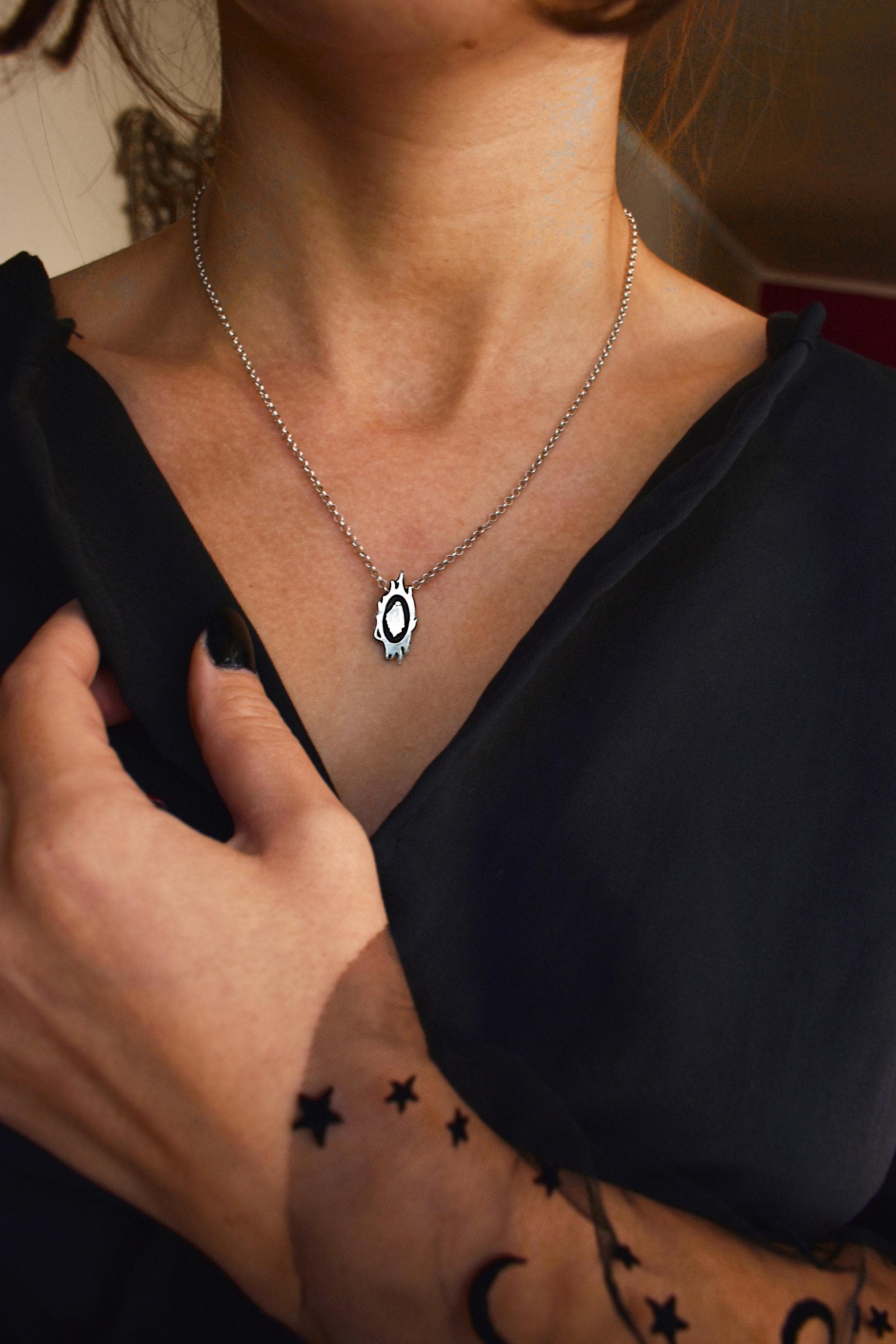 Add a touch of eerie elegance to your jewelry collection with this Ghost necklace. This spooky design features a delicate ghost surrounded by intricate spiky detailing. This piece for me is a symbol of how memories are haunting us sometimes like ghosts.