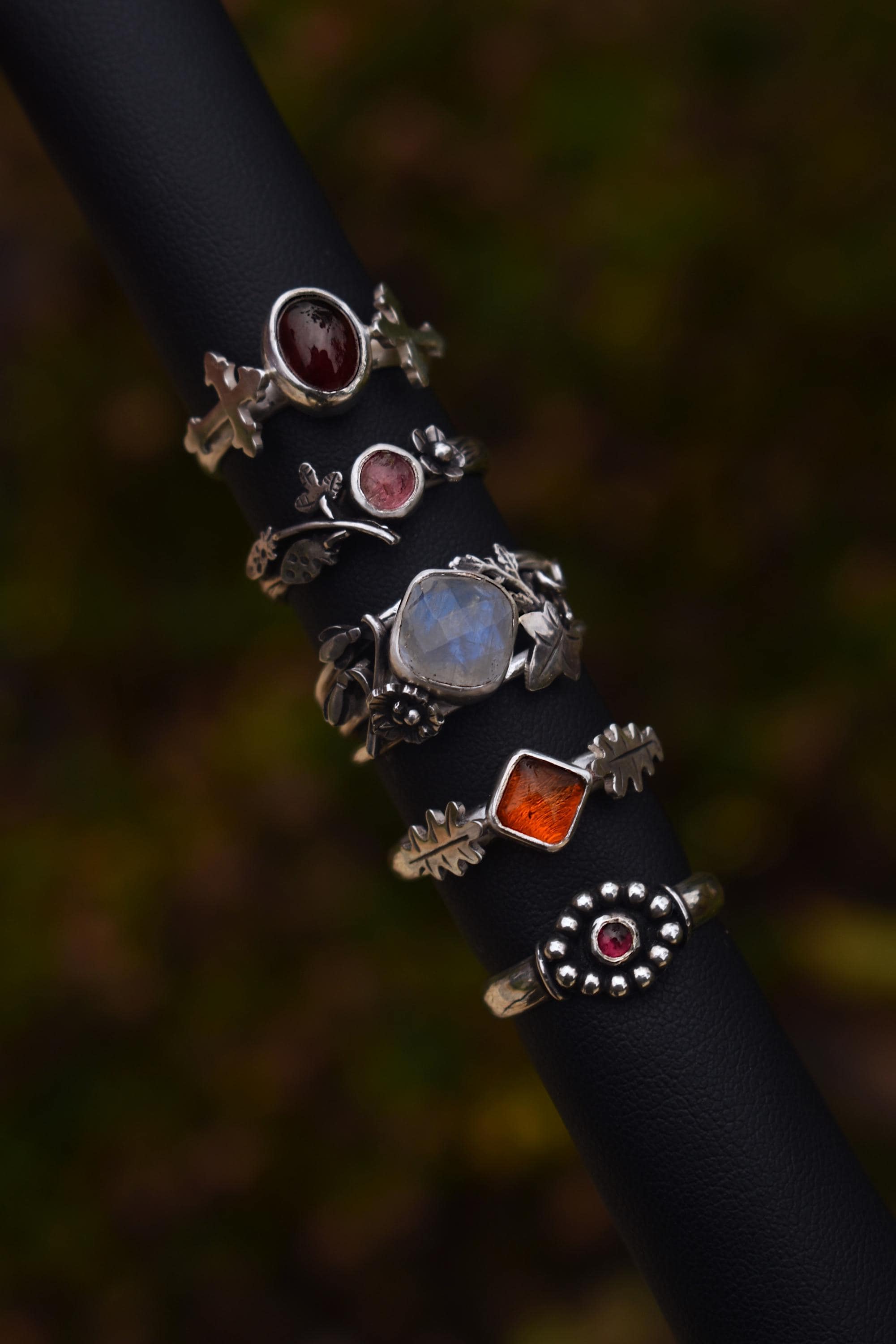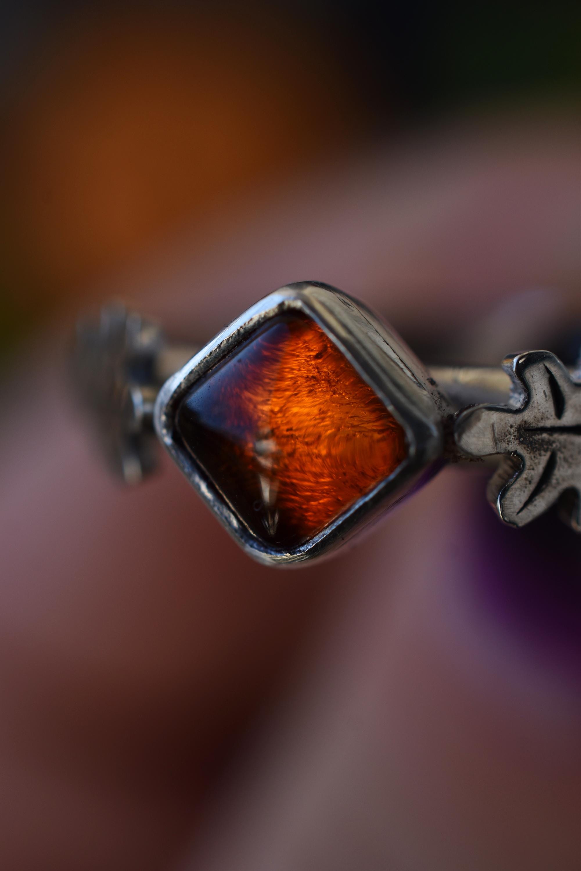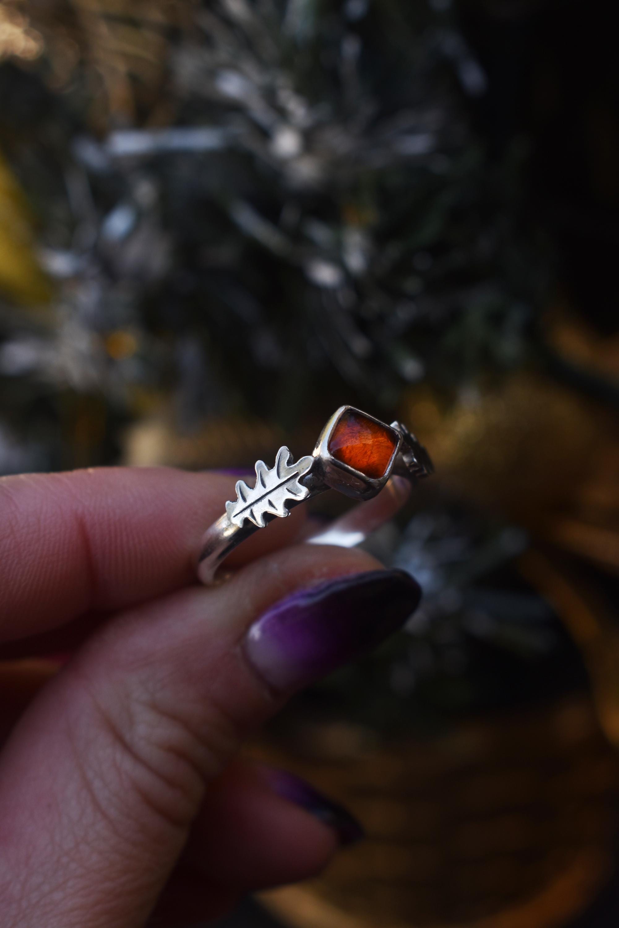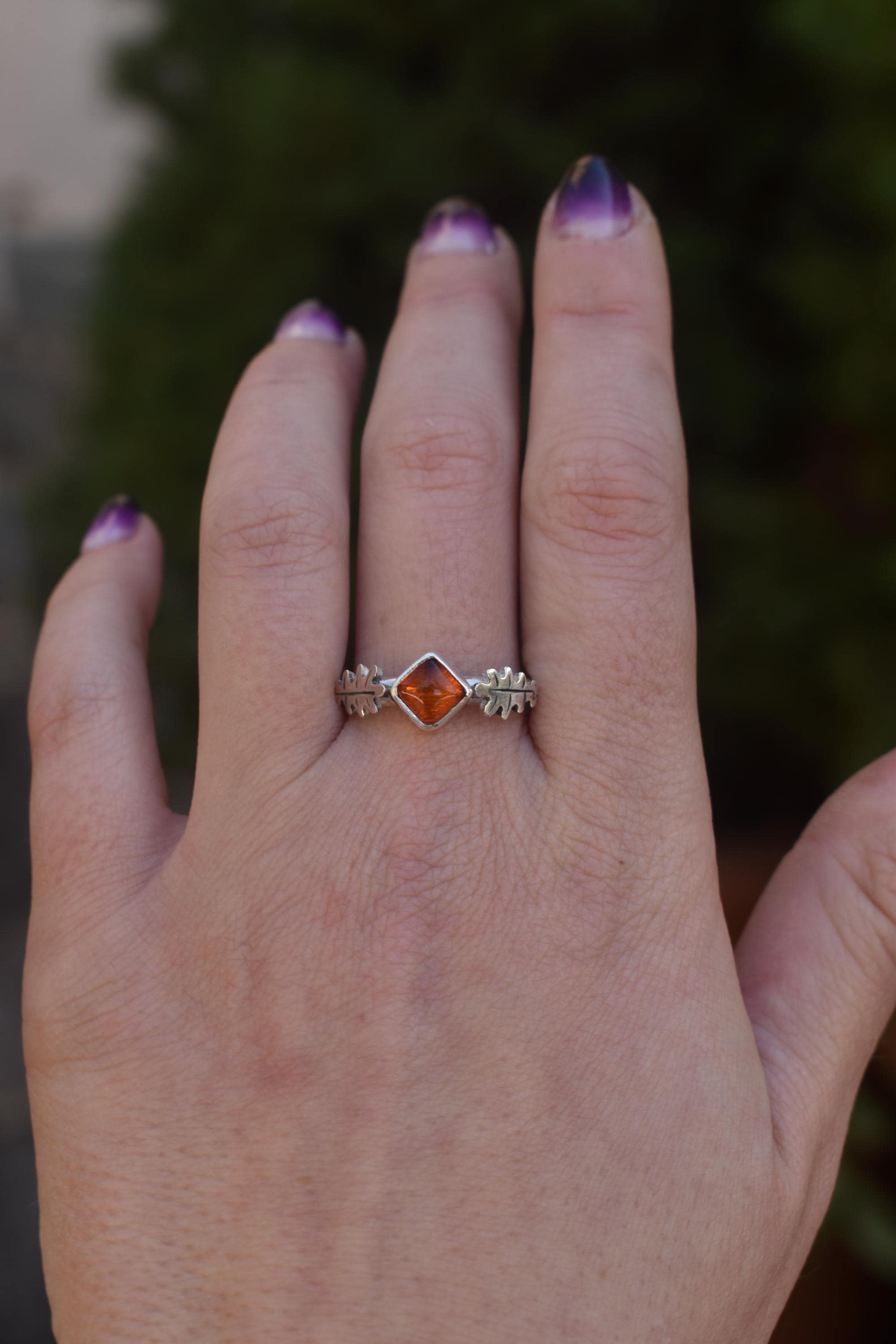 The ring features a beautiful a. with oak leaves left and right. The oak leaves are made by hand. aw individually from sterling silver sheet them engraved to have a more realistic look.