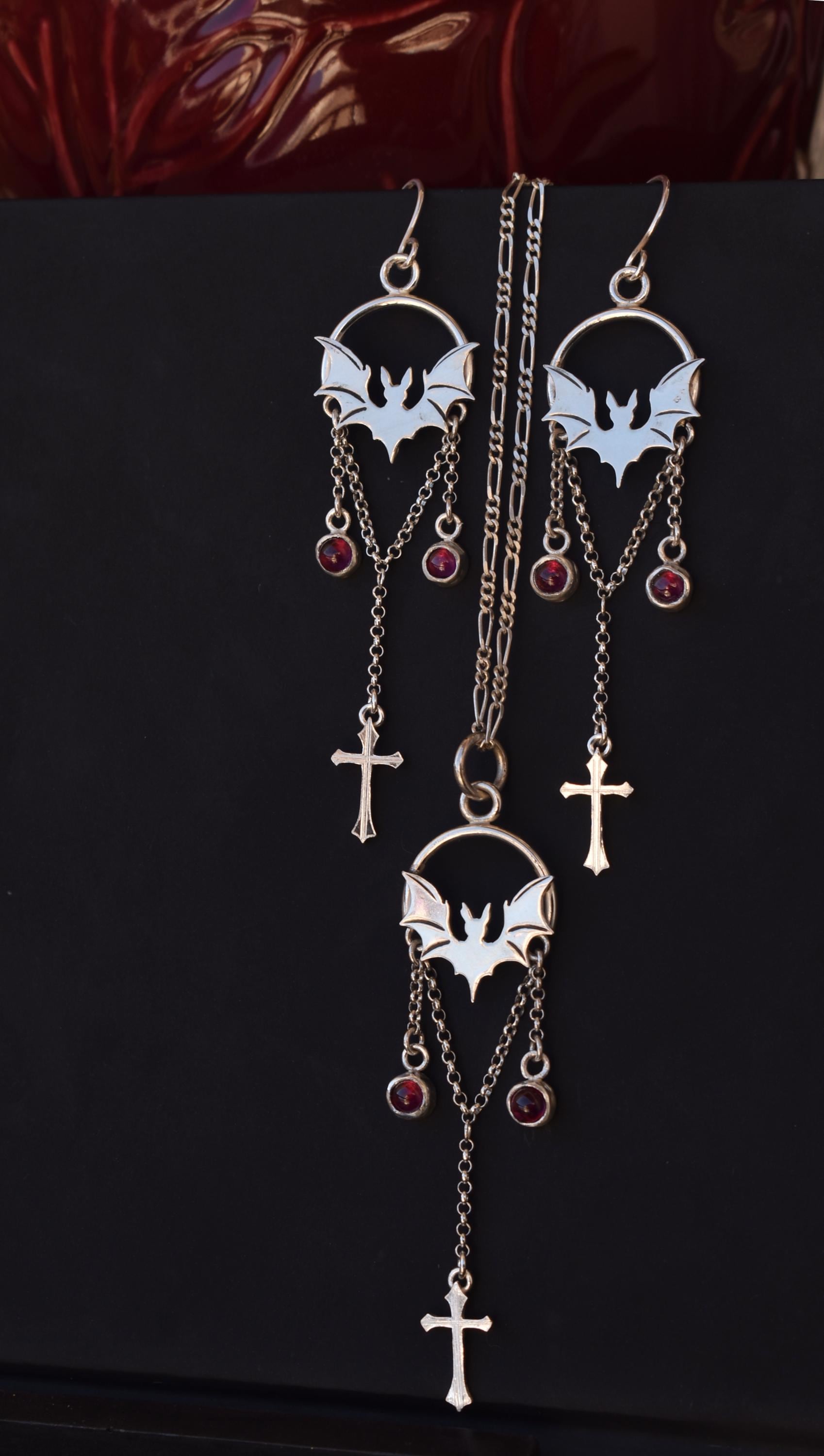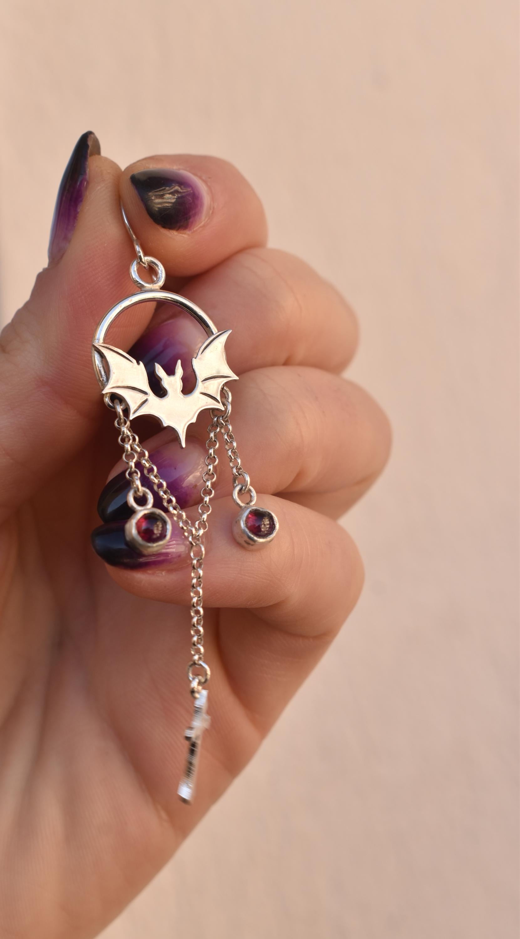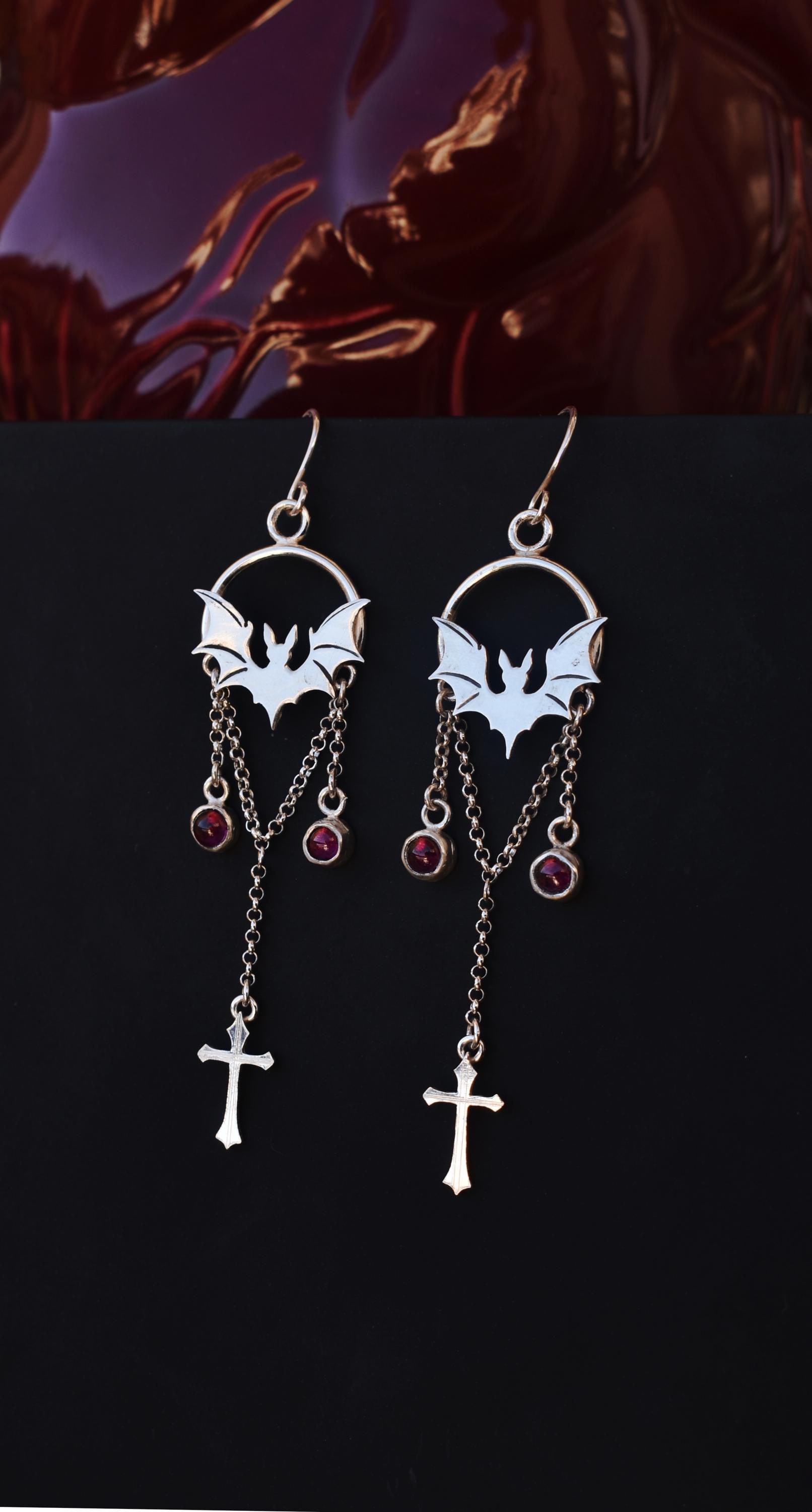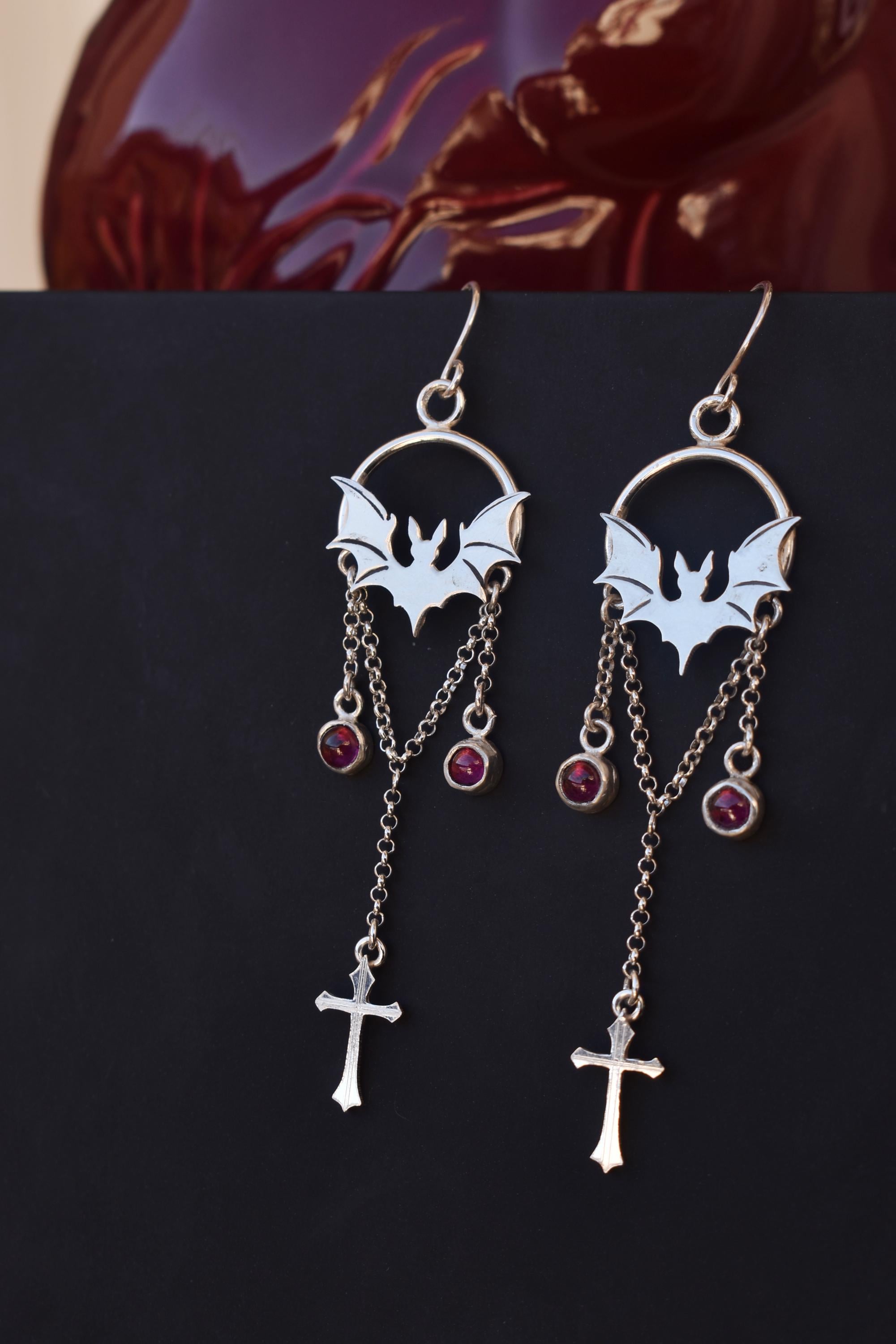 A statement piece of earrings! The earrings are long but lightweight. They feature bats,crosses and two garnets each. All the elements are saw by hand from solid sterling silver sheet. The garnets are set in fine silver bezels with close back plates. ALL the jump ring are soldered shut!