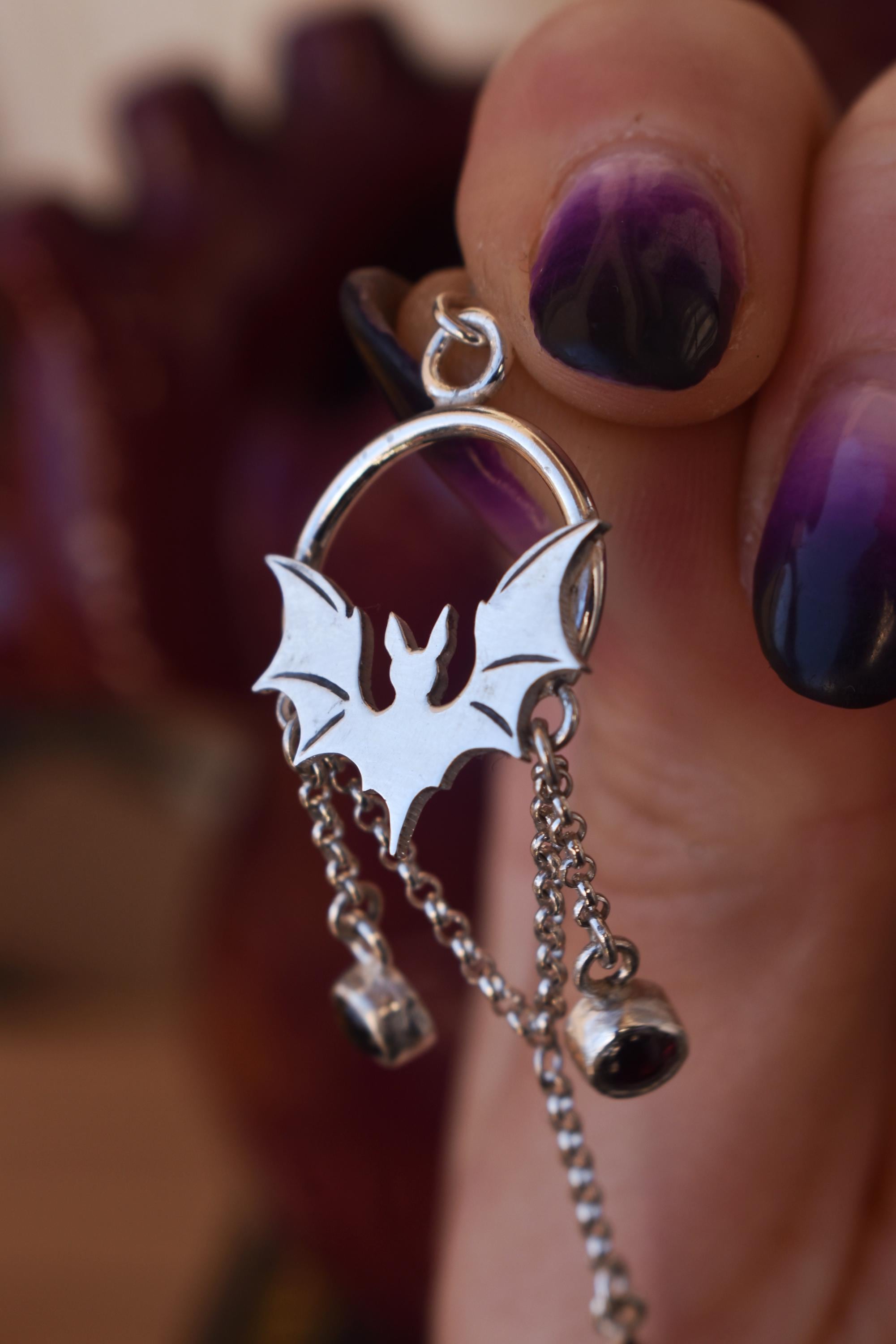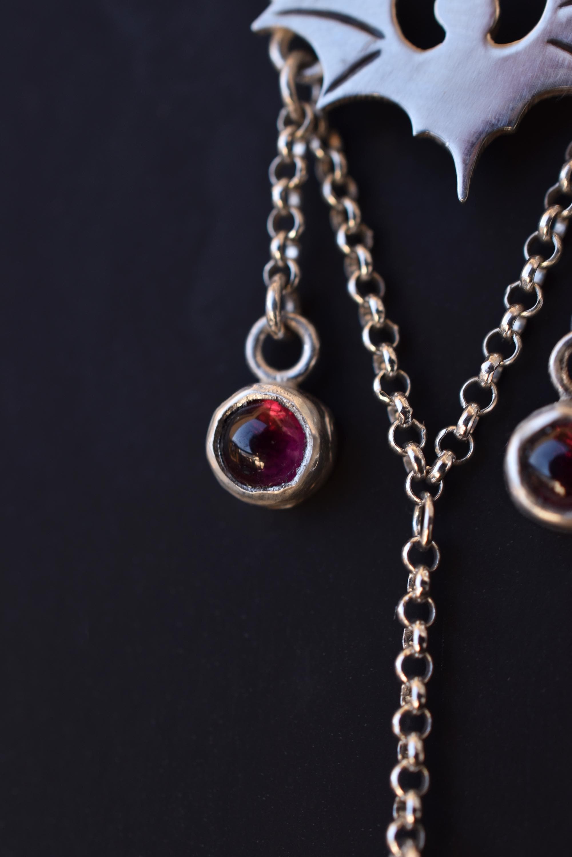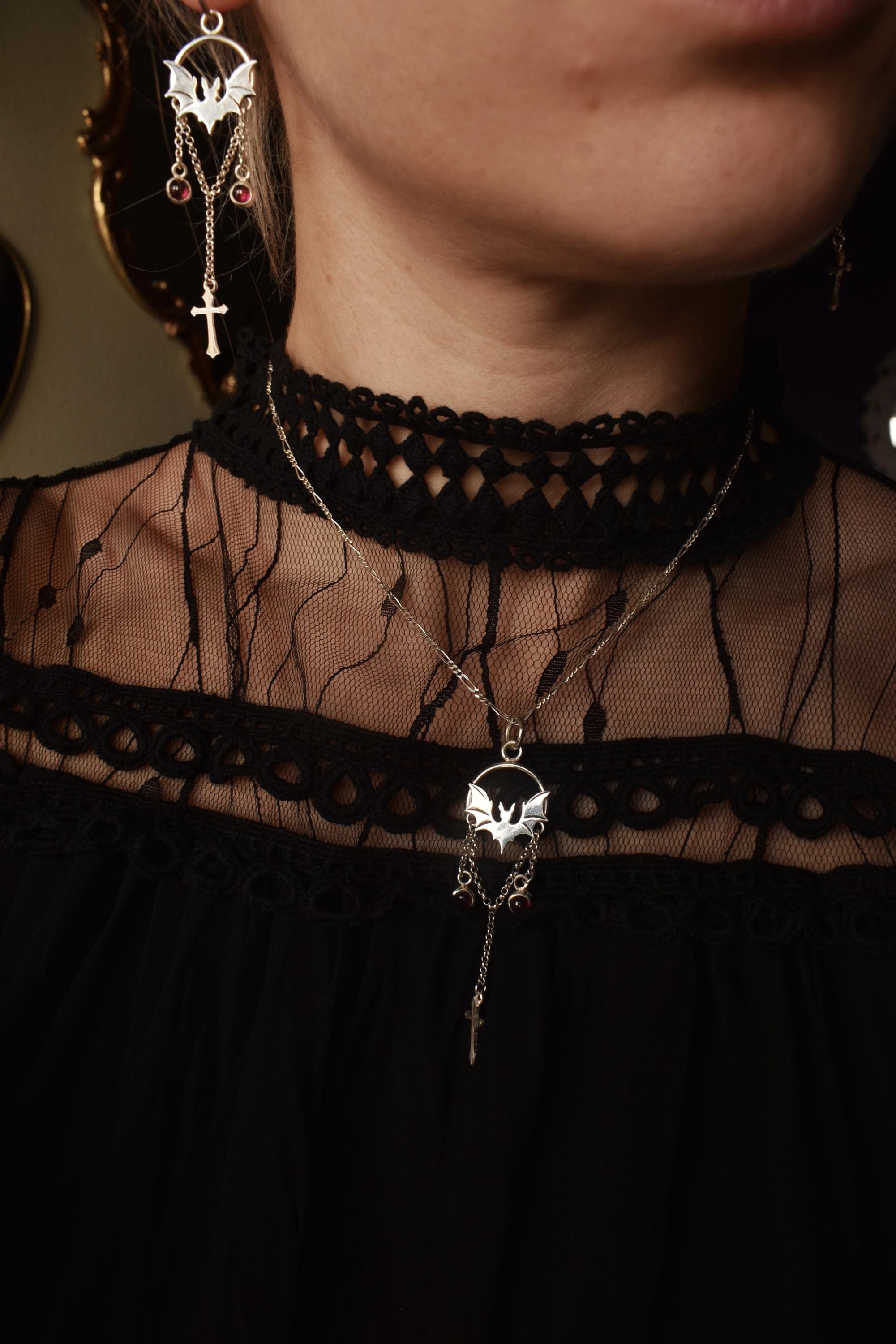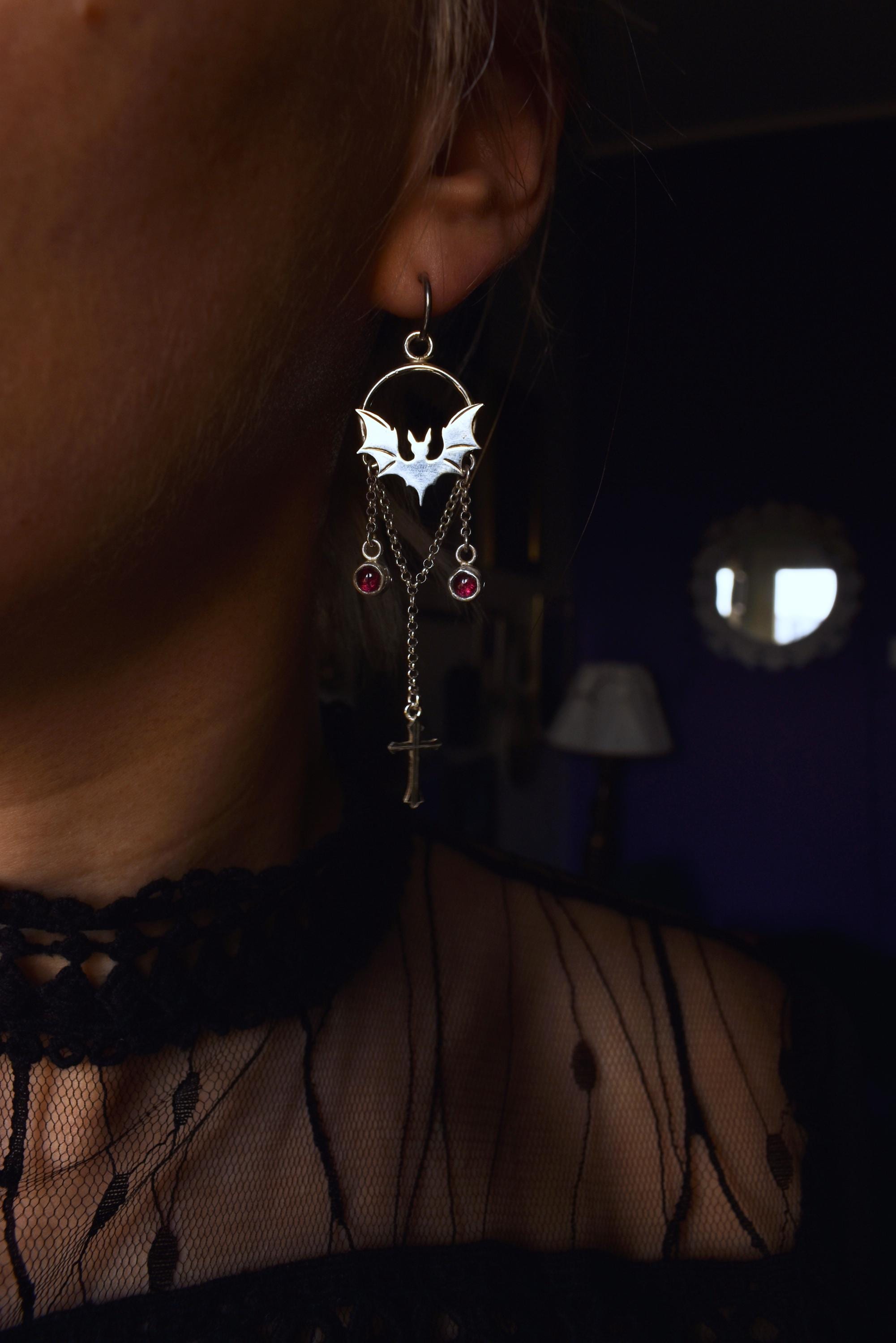 A statement piece of earrings! The earrings are long but lightweight. They feature bats,crosses and two garnets each. All the elements are saw by hand from solid sterling silver sheet. The garnets are set in fine silver bezels with close back plates. ALL the jump ring are soldered shut!