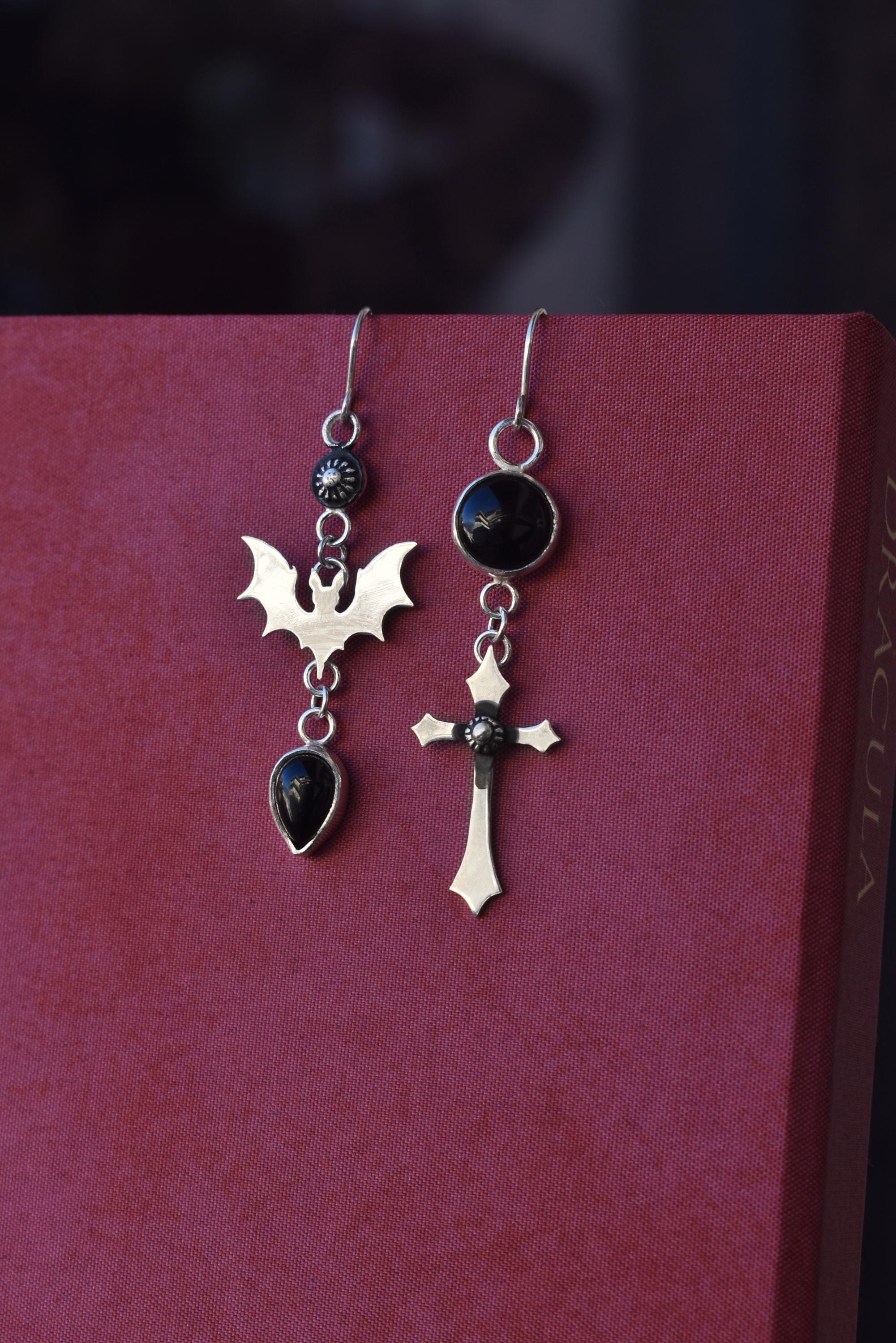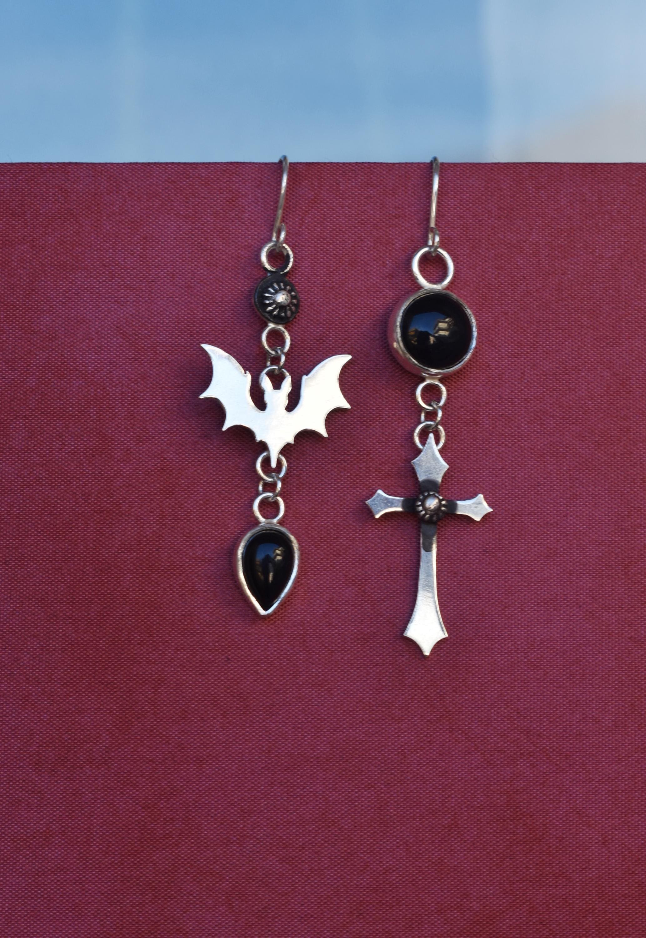 A pair of mismatched earrings featuring a bat,a cross and black onyx. The elements are amde by hand from solid sterling silver sheet. The stones are set in fine silver bezels. all the jump ring conencting the elements are soldered shut!